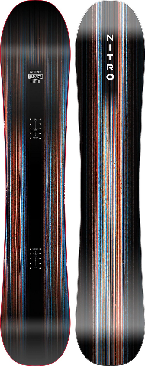 The Nitro SMP snowboard is for snowboard adventurists and daydreamers looking to create their own way down any marked or unmarked trail searching for the next greatest sidehit, bank, or turn.
