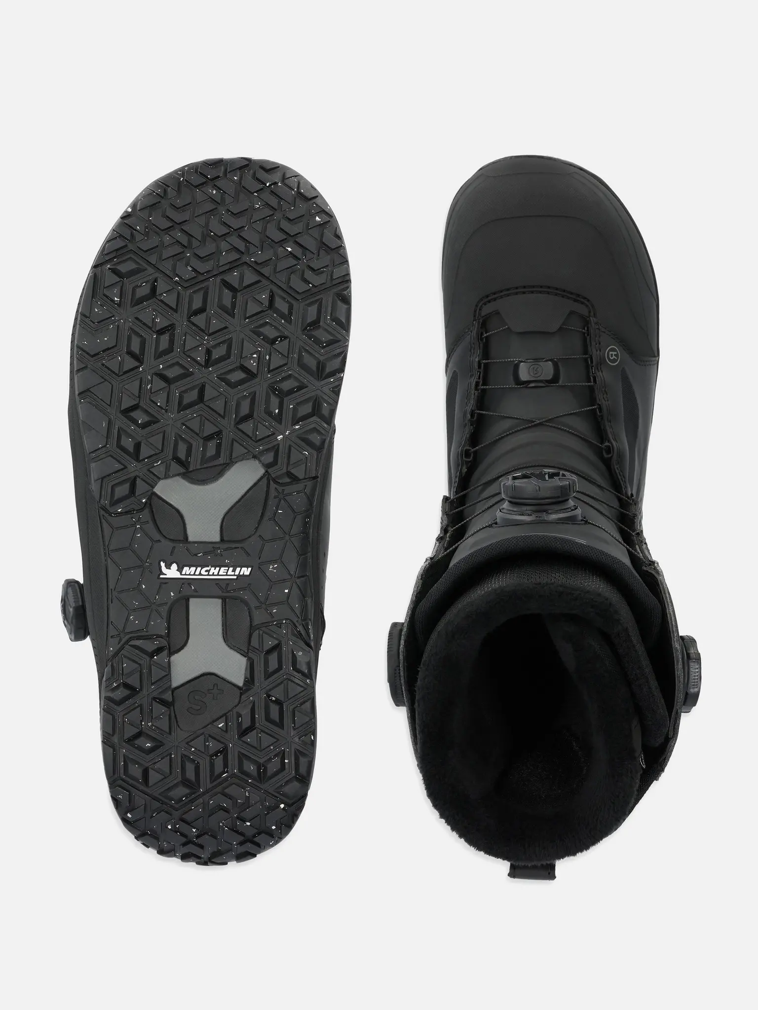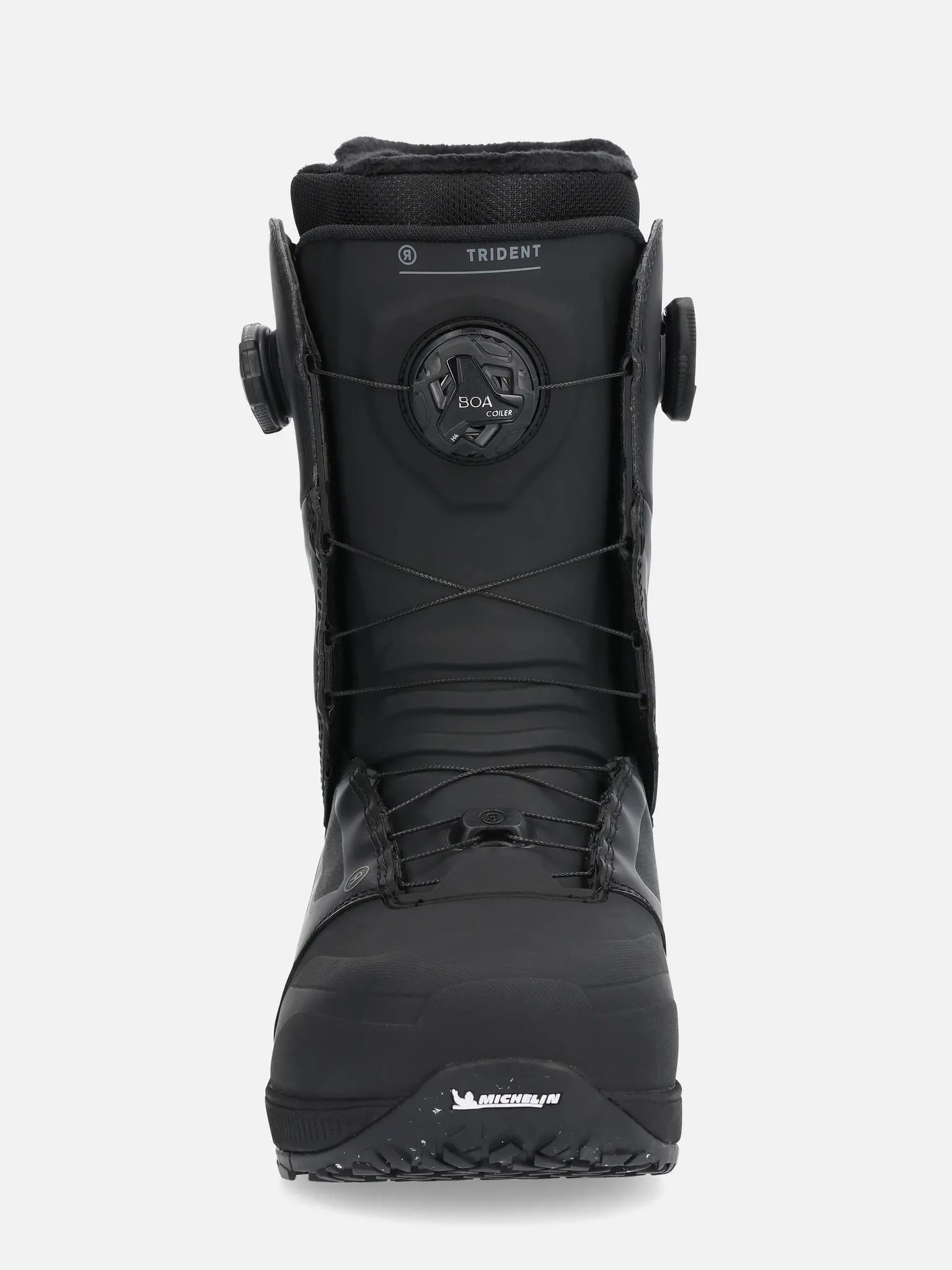 Fitted with our Intuition™ Dream Liner and the Tongue Tied™ Hybrid Harness system combined with The Closer™. Tongue Tied™ delivers a secure micro-adjustable fit in the ankle and eliminates the need for a traditional harness while Flex Slime Tongue™ provides rebound and damping. The Michelin® Hybrid Traverse Outsole ensures that your boot won’t slip around while strapped in or walking from your car to the lift in an icy parking lot. The Trident features a triple BOA® Fit System and a stiff flex for response and all-mountain performance for the rider who demands more from their footwear.