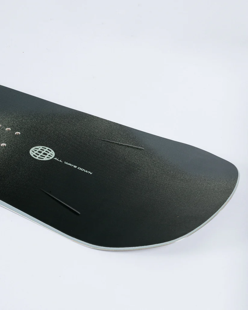 Designed for all-mountain prowess and float in the deep. Rockered in the nose, flat under the front foot, with a positive cambered tail.