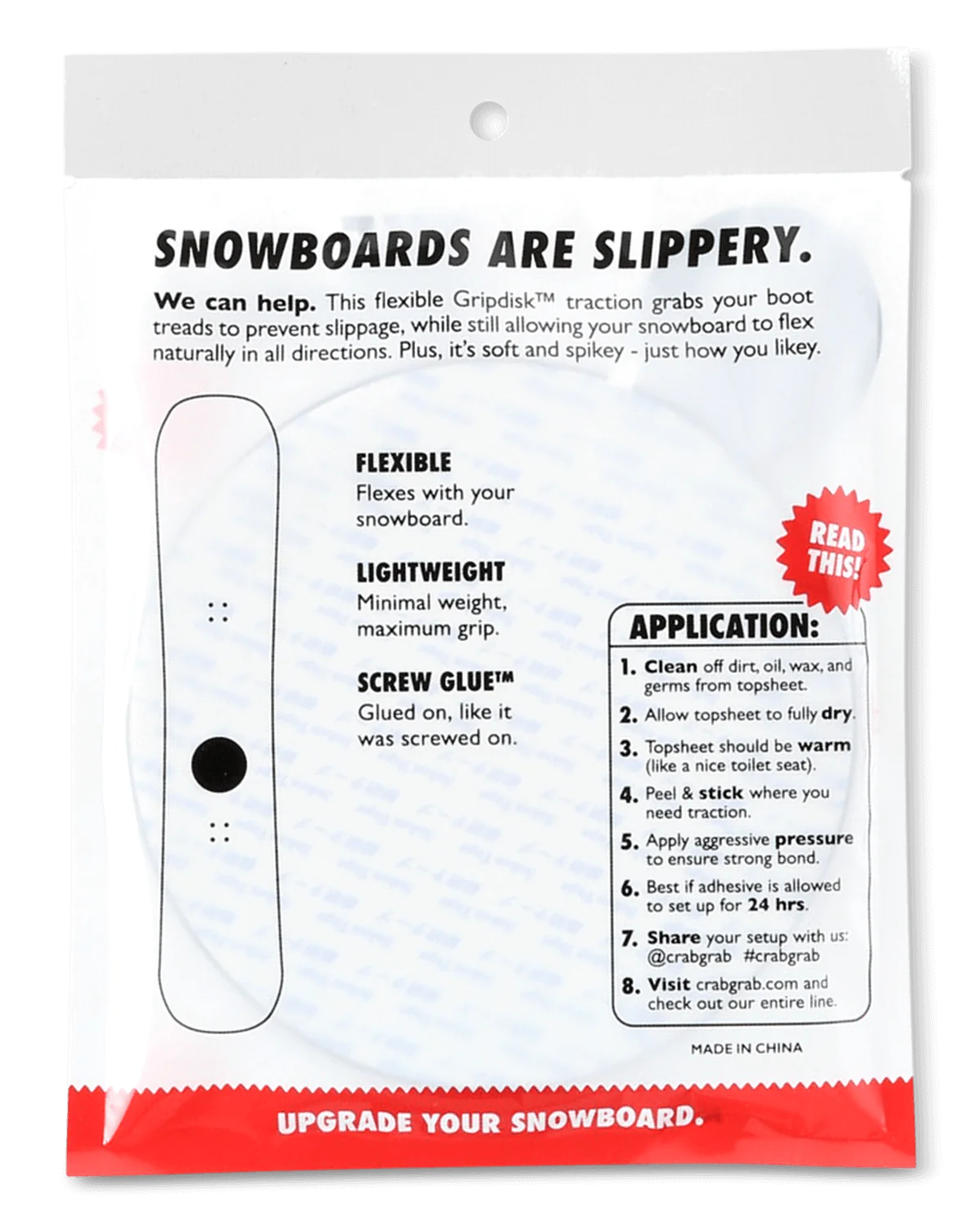The incredible Crab Grab Grip Disk Stomp Pad grabs your boot treads to prevent slippage, while still allowing your snowboard to flex naturally in all directions. Plus, it’s soft and spiky - just how you likey.