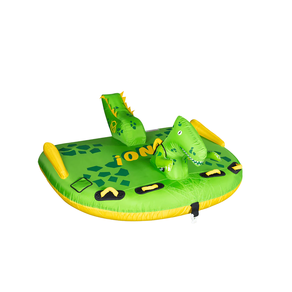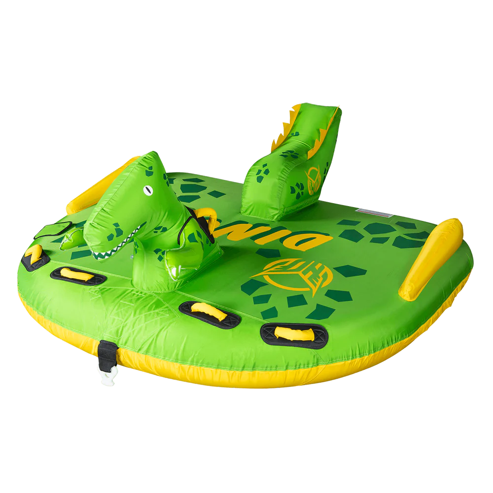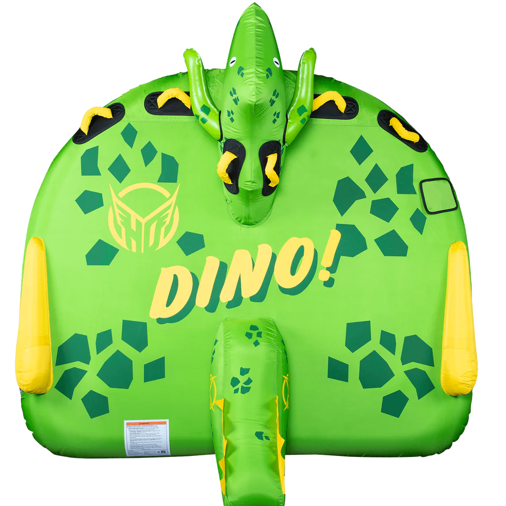 • The Dino is a 3 rider towable tube built for fun days on the lake. The Dino can handle up to 3 riders but it can be ridden by 1, 2 or 3. The center rider sits on the deck of the tube while the outside riders lay in the prone position.