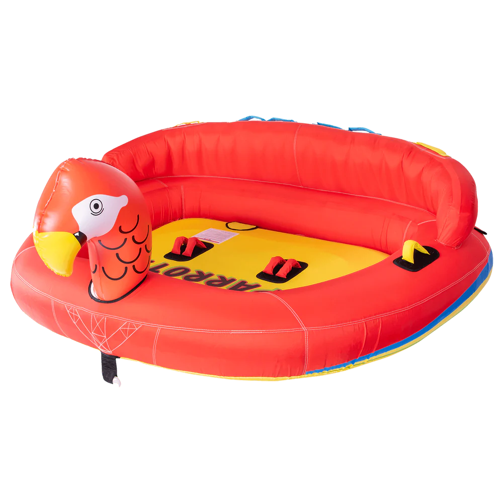 The Parrot is a 3 rider towable tube built for fun days on the lake. The Parrot can handle up to 3 riders but it can be ridden by 1, 2 or 3. All 3 riders are enclosed in the secure, cockpit seating area. . Looking for a change of pace? The Parrot can be towed backwards as well for a different riding style Built with only the finest materials and guaranteed with our 1 year warranty, this tube will keep you where you want to be…on the water. • Fun, kid friendly animal design • Secure, Cockpit seating area • Multiple tow points – tows in either direction • HO Quick Connect Tow Attachment System • Heavy-Duty Boston Valve for quick and easy inflation and deflation • Heavy-Duty PVC bladder • Nylon webbing covered soft foam handles • 1 Year limited warranty