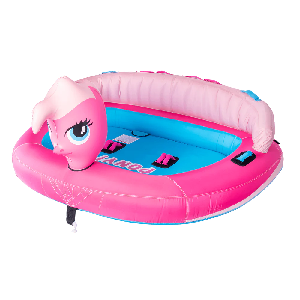The Pony is a 3 rider towable tube built for fun days on the lake. The Pony can handle up to 3 riders but it can be ridden by 1, 2 or 3. All 3 riders are enclosed in the secure, cockpit seating area. . Looking for a change of pace? The Pony can be towed backwards as well for a different riding style Built with only the finest materials and guaranteed with our 1 year warranty, this tube will keep you where you want to be…on the water. • Fun, kid friendly animal design • Secure, Cockpit seating area • Multiple tow points – tows in either direction • HO Quick Connect Tow Attachment System • Heavy-Duty Boston Valve for quick and easy inflation and deflation • Heavy-Duty PVC bladder • Nylon webbing covered soft foam handles • 1 Year limited warranty