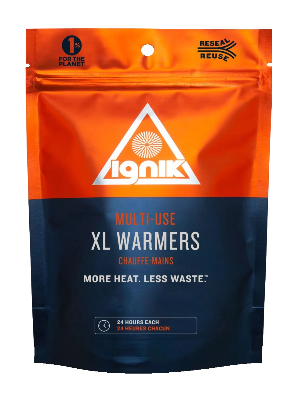 Ignik 24 XL Warmers are Arctic Grade, designed to solve the biggest problems you face with cheaper air-activated warmers; providing reliable, consistent, and long-lasting heat when you need it and with less waste. We start with the highest quality, naturally active ingredients. The contents are safe, all-natural, and biodegradable. Our Patent Pending AirBarrier™ pouch keeps more air out for more reliable heat - up to 24 hours each, more heat than the leading brands. The resealable top gives you control to use the warmers when you need them. Store unused open warmers for up to 72 hours later. The outer pouch is re-usable and 100% recyclable. The end result is a higher performance warmer, which is more efficient and less wasteful.
