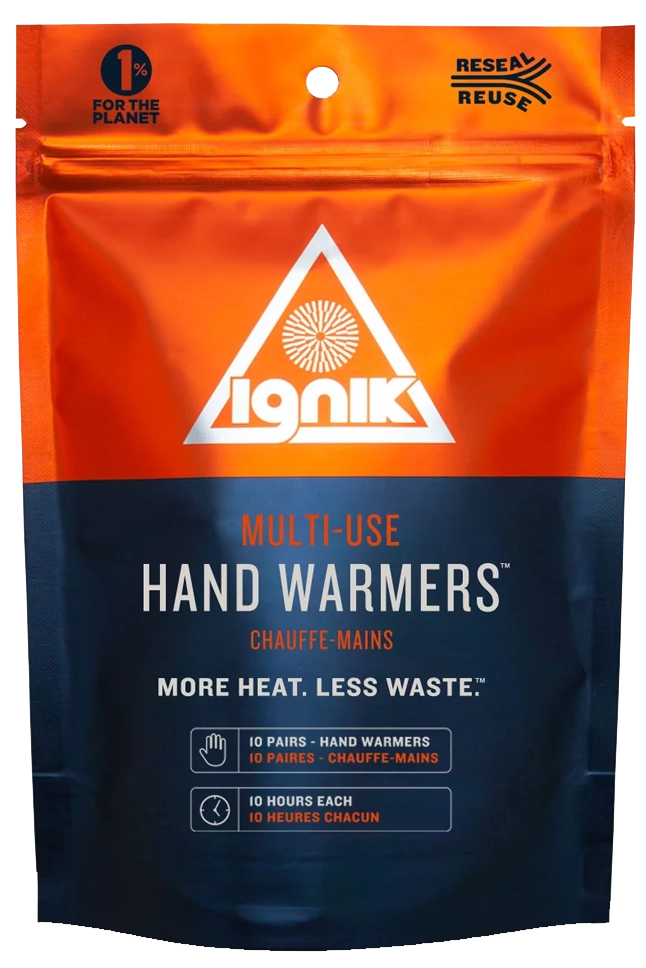 Ignik Hand Warmers are Arctic Grade, designed to solve the biggest problems you face with cheaper air-activated warmers; providing reliable, consistent, and long-lasting heat when you need it and with less waste. We start with the highest quality, naturally active ingredients. The contents are safe, all-natural, and biodegradable. Our AirBarrier™ pouch keeps more air out for more reliable heat - up to 10 hours each, more heat than the leading brands. The resealable top gives you control to use the warmers when you need them. Store unused open warmers for up to 72 hours later. The outer pouch is re-usable and 100% recyclable. The end result is a higher performance hand-warmer, which is more efficient and less wasteful.