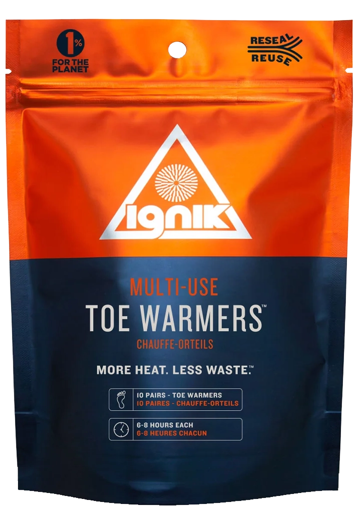Ignik Toe Warmers are Arctic Grade, designed to solve the biggest problems you face with cheaper air-activated warmers; providing reliable, consistent, and long-lasting heat when you need it and with less waste. We start with the highest quality, naturally active ingredients. The contents are safe, all-natural, and biodegradable. Our AirBarrier™ pouch keeps more air out for more reliable heat - up to 8 hours each, more heat than the leading brands. The resealable top gives you control to use the warmers when you need them. Store unused open warmers for up to 72 hours later. The outer pouch is reusable and 100% recyclable. The end result is a higher performance toe-warmer, which is more efficient and less wasteful.
