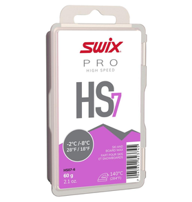 The SWIX HS7 Violet Wax is great for normal winter conditions below freezing. High Speed (HS) is specially developed for younger racers and the ambitious leisure skier. All glide waxes in this series have high performance and good durability. This makes them an affordable option for both competition and training. The hardness makes it easy to work with and it is easy to achieve a good end result. Swix HS7 is great for both training and racing. How to apply HS7: The speed of the waxing iron should be approx. 8-10 seconds for a skating or alpine ski. The wax can be reheated after cooling to room temperature (10 min.) for better durability. It is important to have a good waxing iron in order to melt the wax efficiently. HS7 can be used as a racing wax alone or as a base wax for other racing products. Recommended waxing iron temp.: 150°C. HS7 is available as both wax and liquid products.