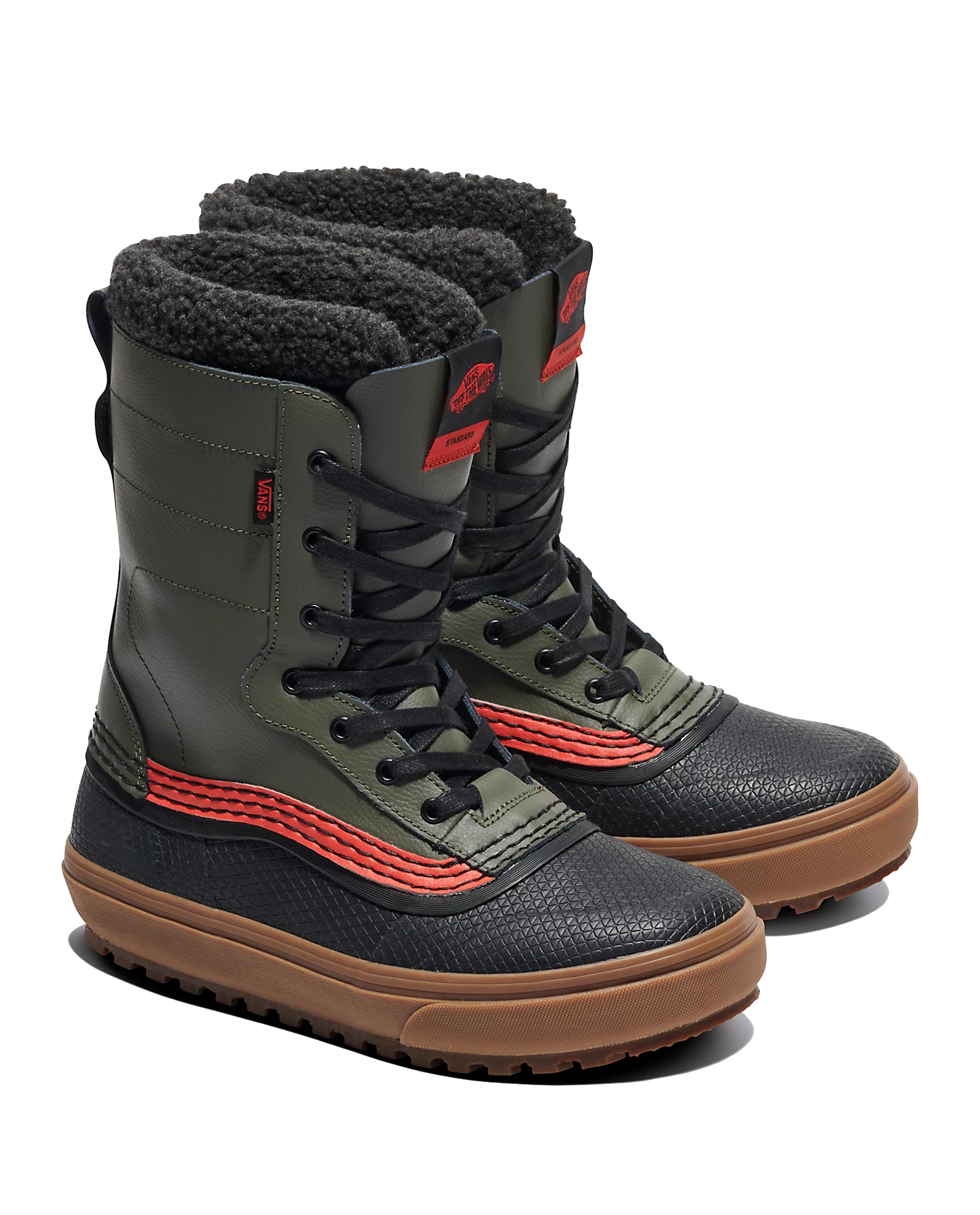 The Vans MTE Standard Waterproof Boot is the modern standard for winter boots featuring waterproofing, warmth, and traction wrapped in Vans style. Complete with a waterproof vulcanized look, heavy-duty felt liner, and Standard Snow MTE outsole featuring All-Trac all-terrain rubber, this Sidestripe snow boot is a contemporary cold weather classic in the Vans family, and the obvious choice for all your winter needs. It is made with leather and rubber uppers.